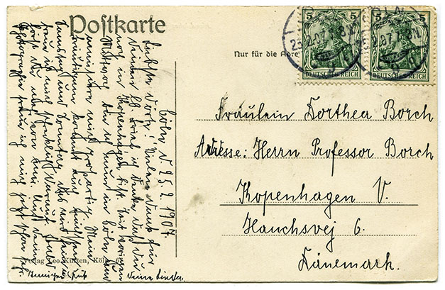 Brevkortet er skrevet den 25. februar 1907, stemplet i Køln samme dag. Det er adresseret til Fräulein Dorthea Borch, Adresse: Herrn Professor Borch, Kopenhagen V, Hauchsvej 6, Dänemark.