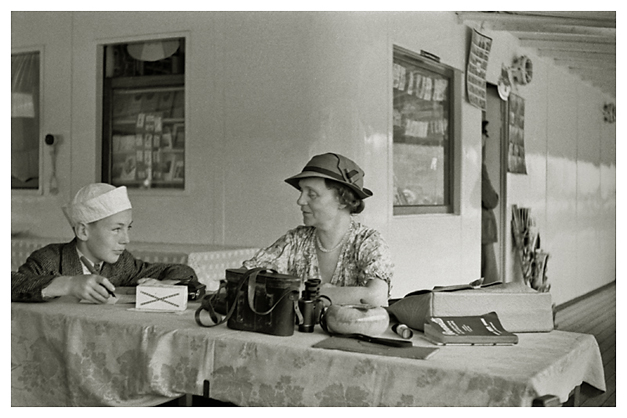 Tirsdag den 21. juli 1936. “Jeg vågnede klokken halv syv, og da jeg havde gjort mig i stand vækkede jeg Ivar og Arne; så var vi ovre at spise vort sidste måltid, og da Oberen hørte, at det var det sidste, beklagede han dybt, at vi rejste, og for så ud, for at komme igen med ”Hans”, der overrakte mig en buket roser, og beklagede, at de ikke havde smukkere roser til mig, men det var virkelig opmærksomt af dem, i de 10 dage er der ingen, der har fået overrakt blomster ved afrejsen.”