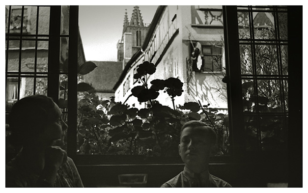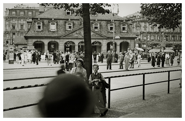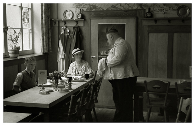 Rejsedagbogen supplerede underteksten med fine detaljer: “…Derefter var vi inde at spise middag i en meget morsom restaurant med hvidskurede borde og en tjener, der var som den tykke mand i Grimms ”De seks tjenere”. Ivar fotograferede dernede fra. Vi spiste kirsebærkoldskål og wienerschnitzel; vi drak Kulmbacher øl og Arne Apfelsaft. Så spadserede vi ad Kaiserstraße og så på butikker; vi var inde [for at høre] om [en] Guldskive [gulfilter] til Ivars apparat; jeg købte et par hvide skindhandsker og en lærredstaske, Arne fik en heftemaskine. Derfra gik vi til banegården og hentede penge, og så tilbage til hotellet og hvilede os lidt.”