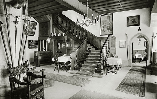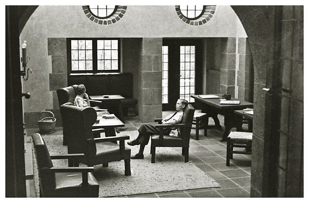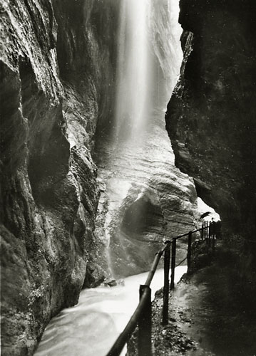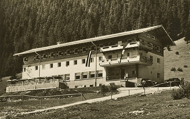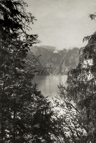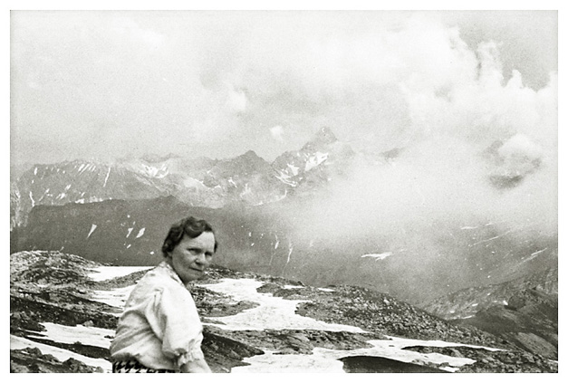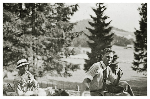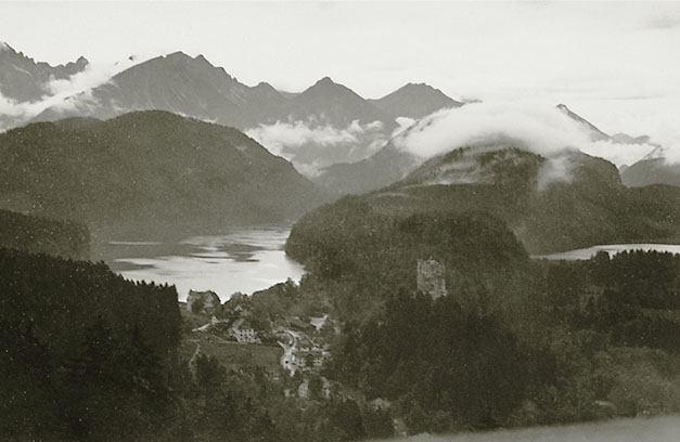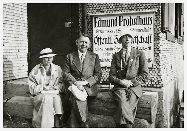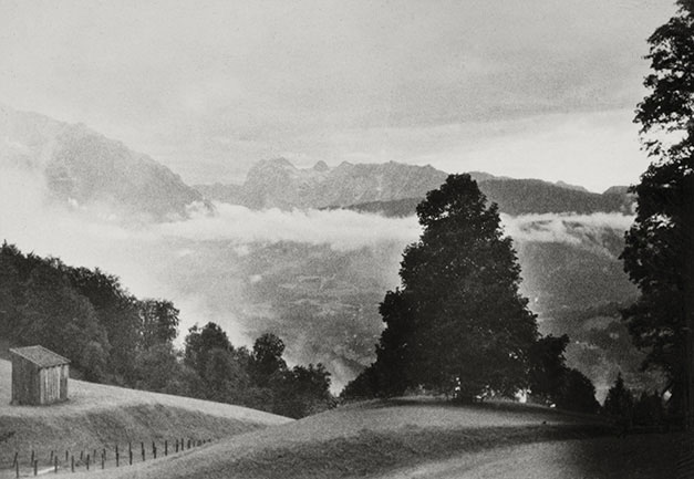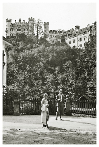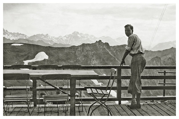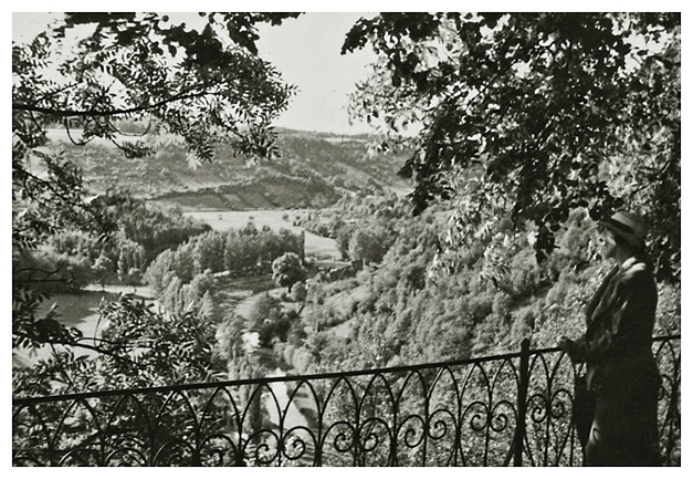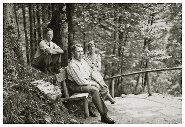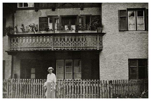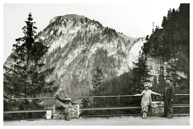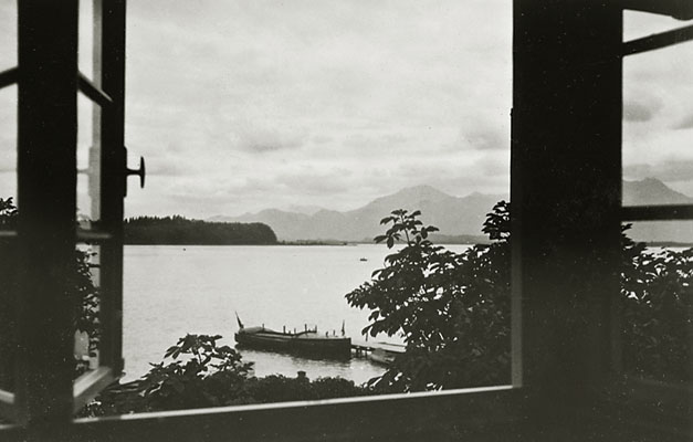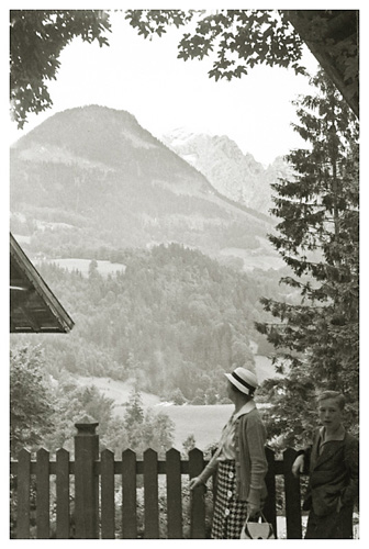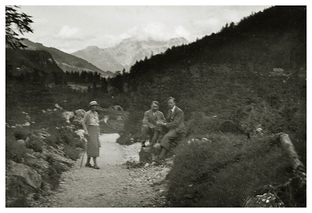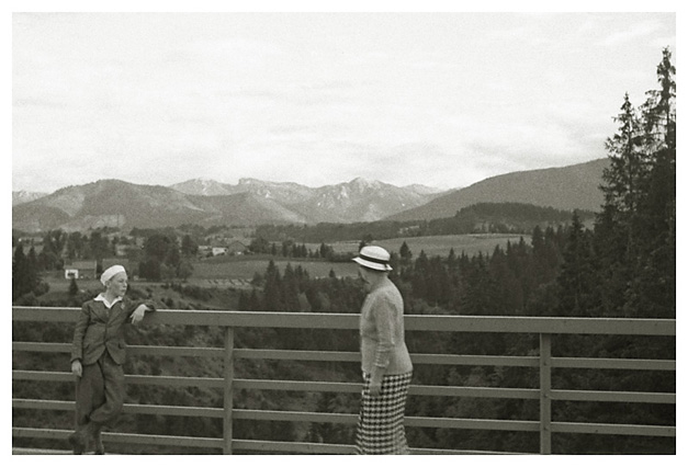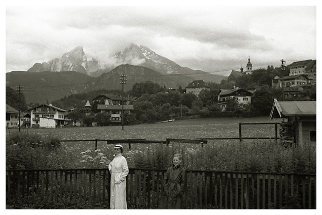 “…hvorfra udsigten er ganske enestående. Ivar fotograferede den fra to sider; der sad vi i meget elegante omgivelser, drak kaffe og chokolade med kager til og lod tordenvejret passere; vi havde et enestående skypanorama, så man skulle tro at det var på et teater, snart klart, så kridhvide skyer, ofte med huller i, hvor igennem vi så snart byer badet i sol, snart bjergtoppe, så pludselig forsvandt hele panoramaet og man kunne tro, at træet ude i haven var verdens ende; vi har aldrig set noget lignende; i radioen hørte vi Lohengrin transmitteret fra Bayreuth, hvor Festspielene begyndte, og hvor Hitler var taget hen; han kørte forleden gennem Berchtesgaden, medens vi var her. Dr. Bachmann trakterede med likør til afsked; han fik alle Arnes billeder fra turen til Almbachklamm og turen til Hintersee-Ramsau. Det meste af et par timer sad vi der, så begyndte nedstigningen ad en anden vej…”