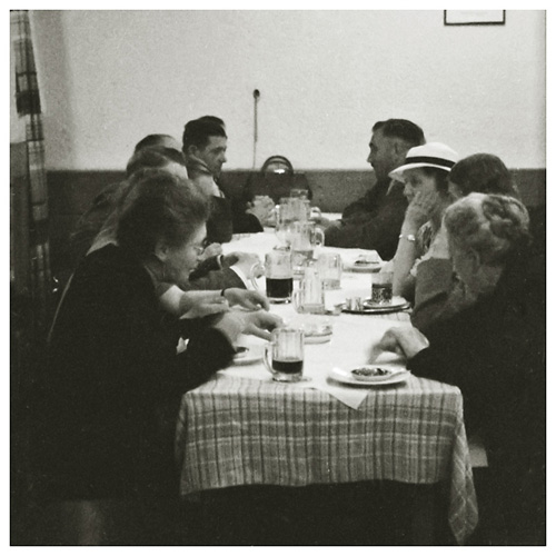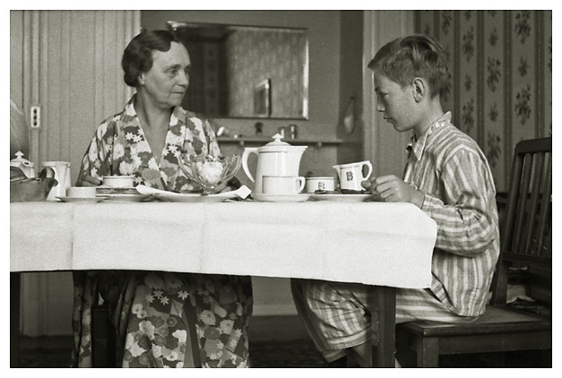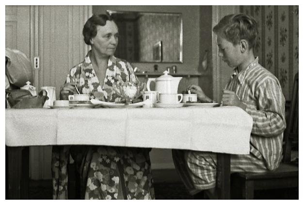 Dorthea og Arne på Hotel Baltic i Berlin. “Ved morgenmåltidet på værelset på “Baltic”. Arne er ved at tage et stykker sukker, måske har Ivar været bange for at billedet er rystet, for han har taget et mere, se næste…”