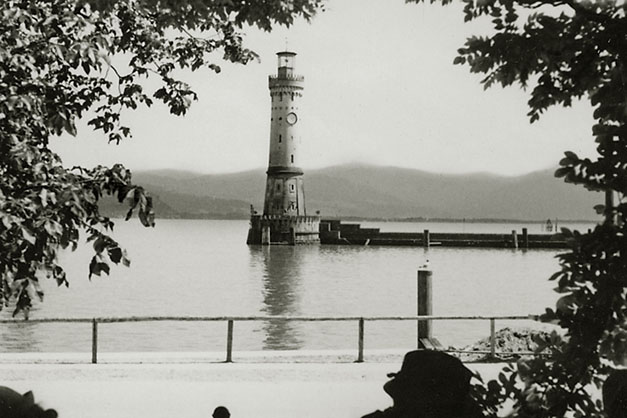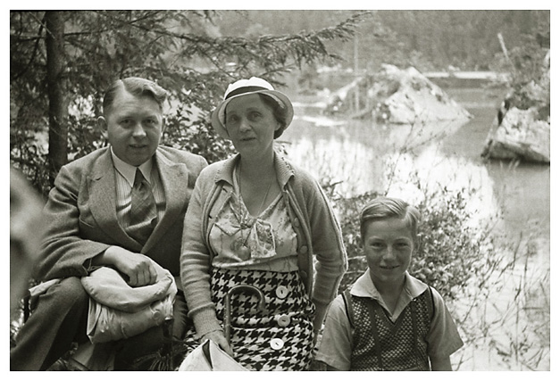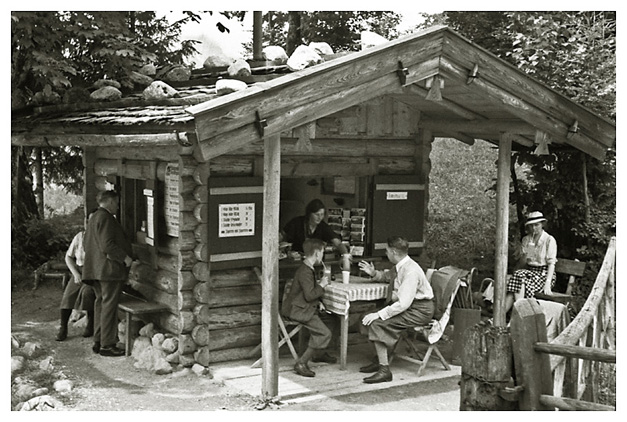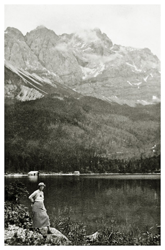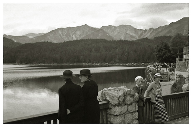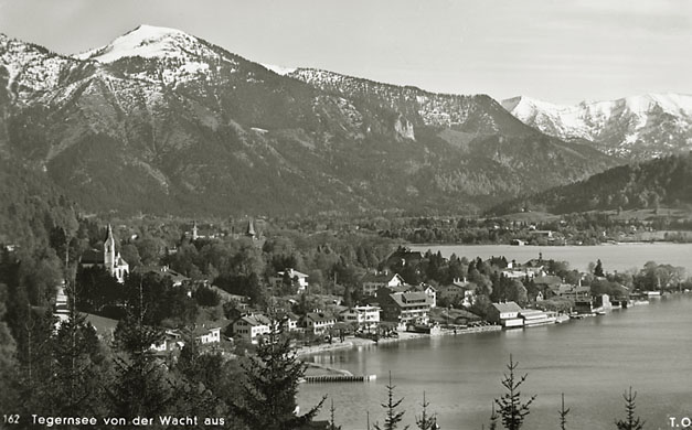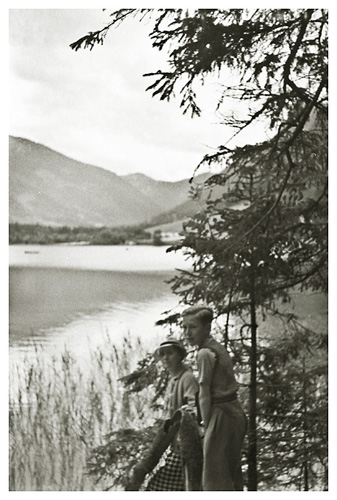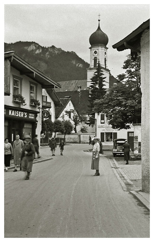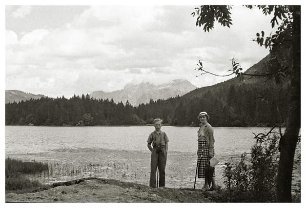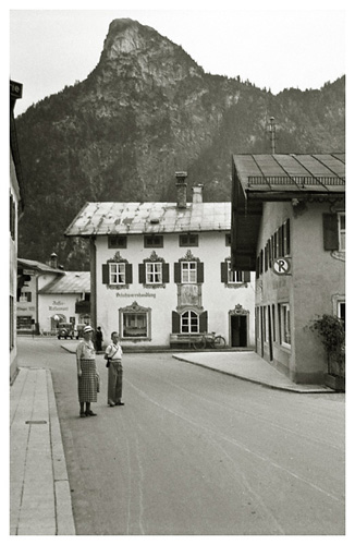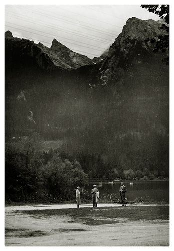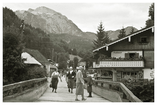 Lørdag den 18. juli 1936: “Vi vågnede i strålende sol, men forfærdelig varme, så vi gad ikke røre os om formiddagen. Ivar og Arne ordnede billeder på værelset, jeg gik i byen og købte billeder og kop og tallerken med ensian og hentede Ivar og Arne til at fotografere hovedgaden (på hjørnet) hver sin vej med Watzmann i baggrunden (Ivar) og den modsatte vej (Arne); mødte fru og frk. Schneider, og Ivar talte med Labo og kone (Tilling) medens vi var inde i boghandelen. Skrev kort til onkel Hanses også om formiddagen. Spiste forholdsvis tidligt i dag, men da det var så hedt tog vi ikke til Obersalzberg. Vi kunne ikke finde doktoren, og tog i stedet for med banen til Köningsee, hvor vi havde en dejlig eftermiddag; spadserede til Malerwinkel og helt ned ved søens bred, hvor vi nød udsigten og skyggen og fotograferede 2 billeder. Gik i langsomt tempo tilbage til anløbspladsen og gik ind på hotel Schiffmeister, hvor vi nød en læskedrik (øl og æblesaft) og Arne spiste en kage til Tyrolermusik og så på folkeliv. En times tid sad vi der og gik så til banen, hvor vi var så heldige at nå et tog, der lige skulle til at gå. Hjemturen var smuk med aftenbelysning på Hohengöll. Var hjemme ved 6-tiden, spiste forholdsvis tidligt til aften, bagefter spillede Ivar og Arne skak inde på mit værelse og vi spiste chokolade og Klosterlikør til og syntes, at vi havde tilbragt dagen på den bedste måde man kunne i en sådan varme og tænkte på Dr. Backmann, der var på tur til Schellenberger Eishöhle, en tur, der varer fra 8 morgen til 10 aften. Om formiddagen havde Ivar og Arne leveret film ind til fremkaldelse (resultat mandag).”