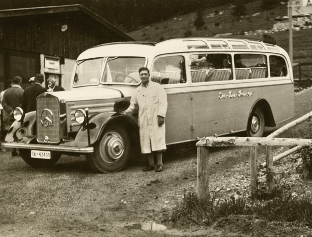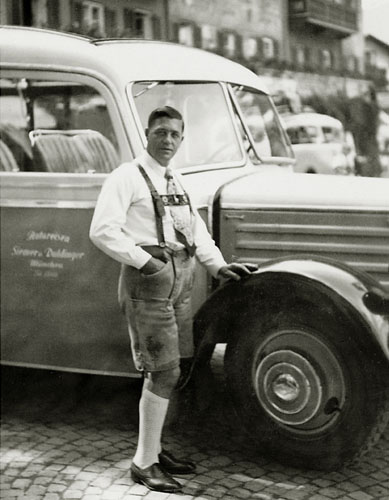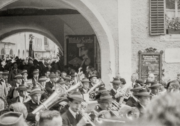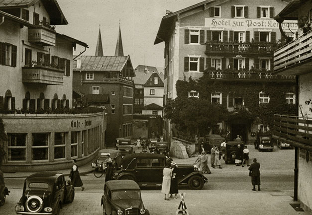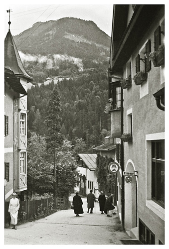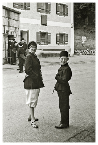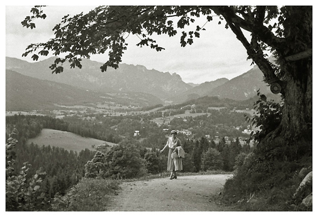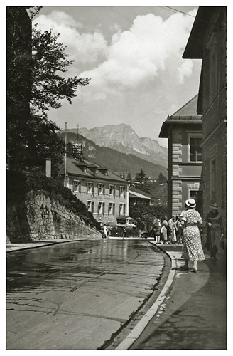 “…da vi kom ned over Marktplatz, var der i hundredvis af mennesker opstillede i geled, og en procession skulle lige til at tage en begyndelse, så vi stillede os også op og så hele optoget med mænd i Tyrolerdragt, pyntet med egeløv og blomster i hattene, bærende store faner, ligeledes bekransede i toppen; nogle gik med store flasker over skulderen, andre med jagthorn, og så et stort hornorkester i spidsen; der var lige så megen trængsel i Berchtesgaden som på strøget ved juletid; Ivar fotograferede optoget, men gik så op på værelset, medens Arne og jeg gik lidt mere i byen og ind gennem kurhaven, hvor Arne fotograferede. Efter middag, 1:30 traf vi efter aftale doktoren og begav os så på vej – gennem kirkegården, hvor vi ikke før havde været, den ligger ganske henrivende – klædt på til regnvejr, da der var lovet Gewitter. Ved banegården er der en bilholdeplads, og der fik vi os en vogn til 2 mark pro persona, der var et fremmed ægtepar med, da vognen skulle være fuld for at gøre turen til den pris; der er kun 50 vogne i alt, der har lov til at køre den vej, og ingen privat vogn; om det er fordi Hitler har sit hjem deroppe, eller for at skåne vejen, der stiger ganske umådelig meget (så de store busser må have tre akser) og uafbrudt går i sving som ”karussellen” i Finnedalen og på kanten af mægtige afgrunde, er ikke godt at vide, men ganske vidunderlig smuk var turen, rigelig de 2 mark værd, og med store vide udsigter, næsten til München kunne vi se gennem et kighul i bjergene, hele det solbeskinnede lavland der. Obersalzberg er en lille bjerby – Tejn er en storstad i forhold – vi gik lidt ned ad vejen for at se Hitlers hus, men der var vagt ved og spærret; ved indgangen lå vagthuset, der var meget større end beboelseshuset, som vi måtte op på bakken for at se. – Görings hus så vi også fra bilen, det ligger isoleret helt oppe på toppen af et lille bjerg; så begyndte vi at vandre men så begyndte også det lovede Gewitter, derfor gik vi ind – et kvarters gang fra Obersalzberg – på et meget elegant hotel ”Antenberg”…”