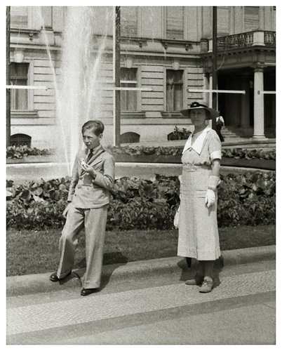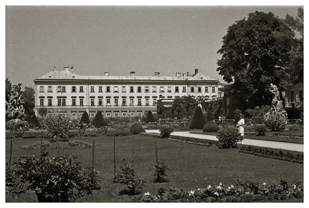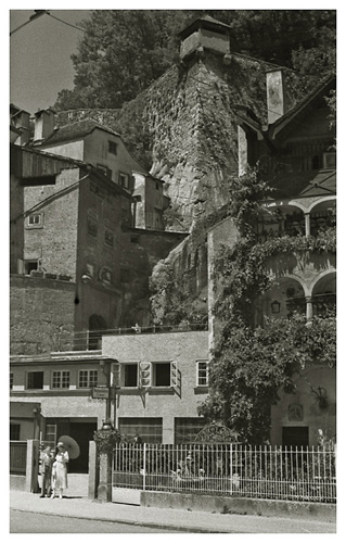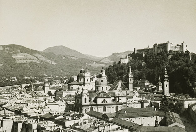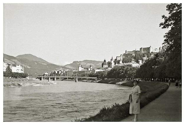 Fredag den 17. juli 1936: “Et kvarter i 7 vækkedes vi, stod straks op og gik så i det mest strålende højsommervejr til banegården og købte billetter til Salzburg; på hjemvejen købte vi frugt og chokolade til turen; så gik vi alle over til morgenmaden, og begav os derefter til stationen; hver gang falder vi i beundring over den herlige udsigt, især om morgenen er belysningen på Watzmann pragtfuld. Køreturen til Salzburg er meget smuk, den tager halvanden time; i byen kører toget, der er lokaltog – i selve gaderne; det var mest danske, der var i toget, tyskerne er forment adgang endnu, men nu kommer der snart en anden ordning, som Salzburgerne glæder sig til, da den ligger som en næsten uddød by, hvad turistliv angår, og den er dog så smuk og egenartet, og dens beliggenhed er aldeles henrivende. Vi gik til Mirabellen-Garten og Slottet …”