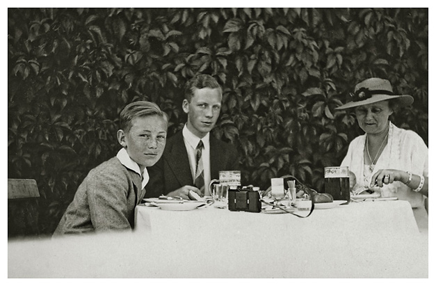 Arne, Ivar og Dorthea oppe på Mönchberg i Salzburg. “Vores fine dyre middag på Mönchsberg”. [Mon ikke der har været selvudløser på Arnes kamera, det ser ud som om Arne og Ivar ved, hvad der sker, mens Dorthea nyder sin middag.]