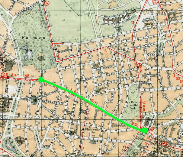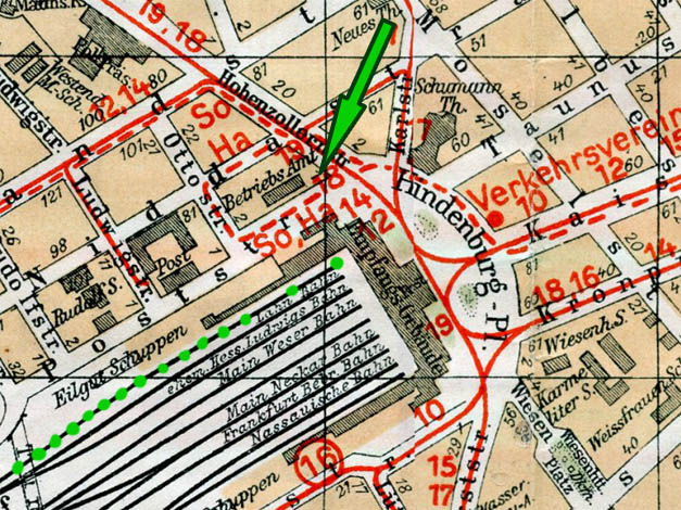 Det lille rejseselskab fortsatte med tog fra Rüdesheim til Frankfurt. “Så kørte vi til Frankfurt…” skrev Dorthea i rejsedagbogen. De er sandsynligvis ankommet til Frankfurt Hauptbahnhof som vist med grønne prikker på ovenstående kort, der er angivet til at være trykt trykt omkring 1928, men det har dog præg af at være ajourført efter 1933, så måske er det helt aktuelt for Dortheas rejse til byen med drengene i 1936.