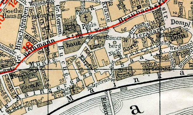 I rejsedagbogen fortsatte Dorthea: “…til Schauspielhaus; så gik vi til Goethe-Haus, til Römerberg og til hele det gamle kvarter…” Vi må antage at da fotografiet ovenfor blev knipset havde de allerede været ved Schauspielhaus og Goethehaus, for disse to steder ligger i modsat retning af Römer.