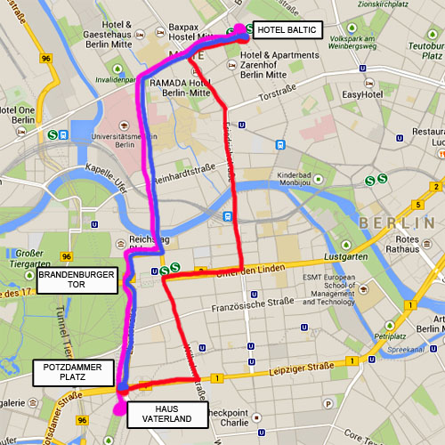 Den røde rute angiver deres spadseretur i Berlins gader. Den blå er den antagne rute for bussen tilbage til hotellet efter gåturen. Den lilla rute er den antagne rute med bus til Haus Vaterland.