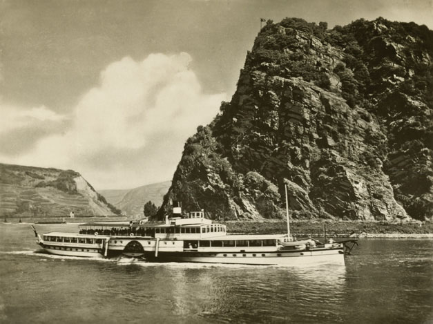 En af de 3 tog et billede af Loreley på netop dette sted, men her er i stedet indsat et prospektkort Dorthea købte, for det viser også hvilken type skib de rejste op ad Rhinen på.
