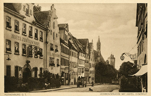 “… et udmærket hotel, hvor vi fik 1 stort og 1 lille værelse, hvor der var dør imellem;…” Hotellet ses yderst til venstre på hjørnet af Hohenzollernstrasse (med sporvognene) og Poststrasse som vi ikke ser meget af, men postkortet giver et godt indtryk af førkrigstidens Hindenburg-Platz, da der var flere store hoteller samt Schuman Teateret der ses til højre. Hotel Exescior blev bombet under krigen og ikke genopbygget i sin oprindelige neo-klassicistiske stil.