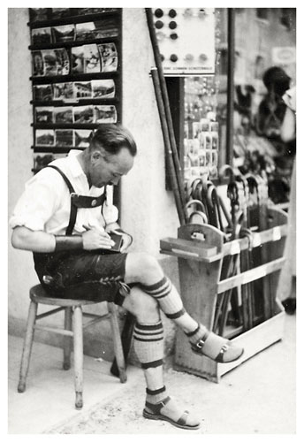 “Der Schnitzer, Arnes gode ven” sidder og arbejder koncentreret, iført sine flotte Lederhosen med seler, og hvid skjorte. I Berchtesgaden er man pænt og regionskorrekt påklædt sådan. Hans “justerbare” 2-delte strømper virker pudsige, men de har sandsynligvis haft et meget praktisk og nyttigt formål. Hans overskæg er også helt i tidens trend.