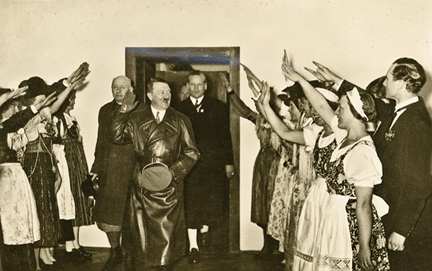 Hotellet havde haft prominent besøg i hvilken anledning personalet var stillet op som modtagelseskommité. Den flinke tjener står yderst til højre og Dorthea gav det undertitlen: “Vor “Ober” hylder “der Führer””.
