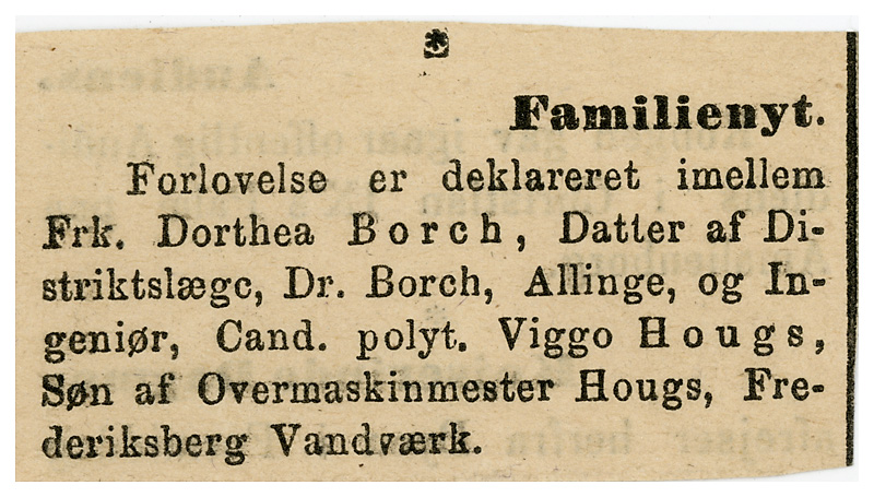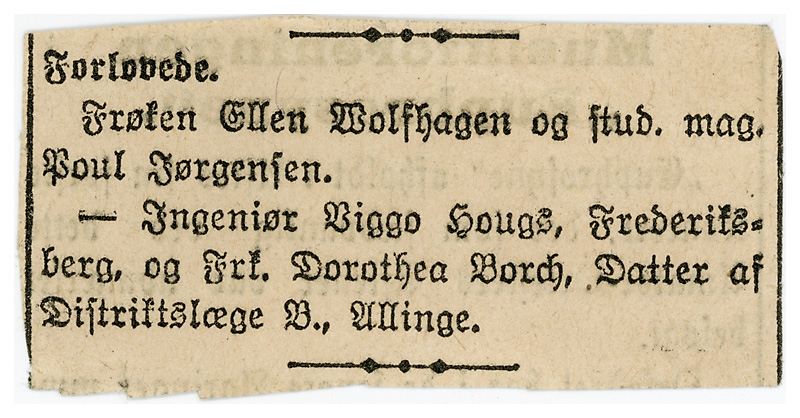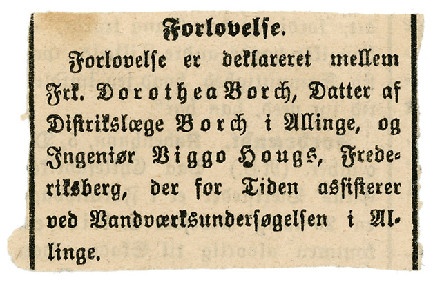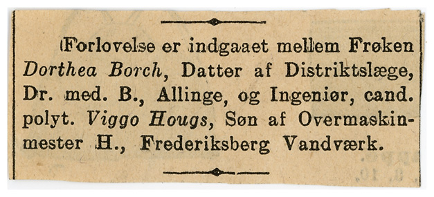 Her er vi vist heldige, hvis vi læser denne lille annoce rigtig, så blev Dorthea og Viggo forlovet mens han var i Allinge og som vi kan læse længere nede, så var Viggo i Allinge mellem oktober 1907 og februar 1908, dermed kan vi vel sige at de ikke har kendt hinanden længe inden de blev forlovede, for der er jo ingen der siger at de mødtes første dag Viggo var i Allinge, og forlovelsen er sket inden han er flyttet tilbage til København.