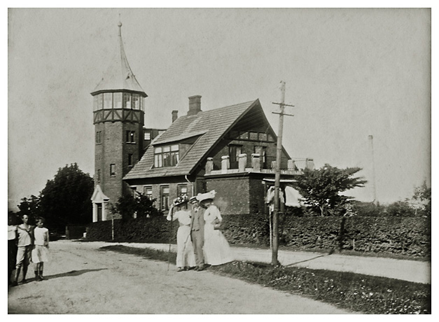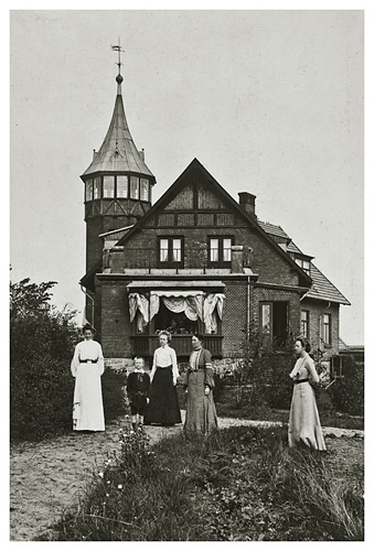 Her ses huset 4-5 år efter det blev bygget, altså i 1902-1903. Træer og buske var stadig lave og gav et godt udsyn til huset, der stod med grundmuret kælder i granitsten, stueetage med højt til loftet og en 1. sal, hvor bindingsværk præger bygningen. Helt oppe er gavlen overraskende i træ. Huset ligger højt i forhold til byen, Allinge, så tårnet kunne ses viden om, hvilket nok også var Johans hensigt. Tårnets vindfløj var udformet som lægesymbolet, slangen omkring nålen. I tårnet var der en lang udtrækskikkert, hvormed skibstrafikken kunne følges, hvis man skulle have lyst til det. Dortheas far var stolt af sit nye hus og han har her igen strategisk placeret persongruppen, så ejendommen i al sin pragt kommer med. Gruppen består fra venstre af: den evigt ukendte unge dame, Sigfred, Dorthea, Thora og Bodil.
