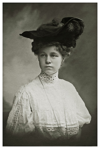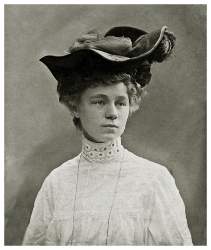 Dorthea er på besøg i København, og ved den lejlighed bliver der taget portrætbilleder af hende hos fotografen, Even Neuhaus, Amagertorv 25. Vi har 2 billeder af hende fra denne seance og der er detaljer at kigge på her. Hatten lader til at være komponeret af tyl, velour, strudsefjer og stofblomster. Den drabelige hattenål, der naturligvis er kalibreret efter alt det den skulle holde sammen på, skinner her blankt. Hvilket stikvåben! Mon der er et ur for enden af den lange halskæde? Hendes alder er svær at fastsætte, men mon vi gætter helt forkert, hvis vi siger 15-17 år?