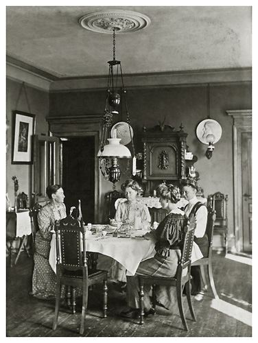 Der spises. Fra venstre: Thora, og hvis vi går med uret rundt om bordet er det Dorthea, en ukendt dame og Bodil. Ellers er det et inteiørbillede med mange interessante detaljer. Feks. den elaborerede petroleumslampe over bordet, og de mindre ved reliefferne øverst på væggen i baggrunden. Reliefferne er af Dortheas far, Johan og hendes onkel, Simon. Er det ikke som om der er ophængt et lille termometer over bordet i højre side af petroleumslampen?
