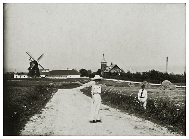 Dette fotografi er taget samme dag som det forrige ved Simonsens Sø. De er til fods, så søen er nok ikke langt fra Allinge. Dorthea står midt på vejen og Sigfred botaniserer tilsyneladende i grøften. Deres far, fotografen, har sørget for at have sit store hus med tårnet i baggrunden. Det er dog interessant for os i og med at det giver et indblik i hjemmets umiddelbare omgivelser.