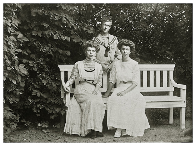 Et billede af de 3 søskende. Det er nok det eneste vi har af de tre sammen. Dorthea ser lidt mellemfornøjet ud og der er egentlig ingen munterhed over dette fotografi. Det giver så anledning til at bemærke de unge damers frisurer, som vi ellers mest ser under meget elaborerede hatte. Frøkenerne lader til at have haft masser af kraftigt hår siden de kunne præstere sådanne voluminøse håropsætninger eller måske har de haft kunstige hjælpemidler til håropsætniner, såkaldte valke. På trods af den lettere tristhed over personerne er der en fin ro over billedet og vi kan beundre Dorthea og Bodils lyse sommerkjoler og notere os at lillebroderen Sigfred er klædt i overensstemmele med tidens drengemode – matrostøj.