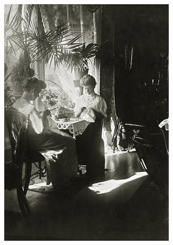 Der broderes. Som i den ovenstående duetscene ses Dorthea (th) og Bodil (tv) i en idyllisk situation ved vinduet, broderende under palmerne. Deres far, Johan, må have elsket at lave opstillinger med personer. Fotografiet er ikke uinteressant mht. lys og skygge, og der er flere detaljer at gå på opdagelse efter.