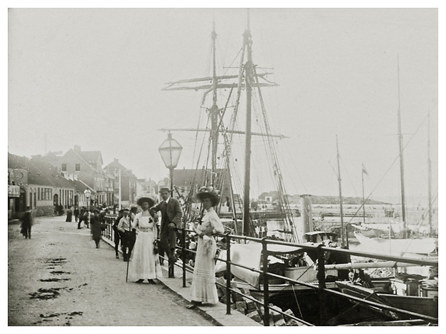 Viggo og Dorthea arrangeret nydeligt på klippetoppen og Bodil halvt siddende med de bare fødder i sandet. Et absolut dejligt billede, der ånder af ro, sol og sommer, selv om Viggo måske ikke er helt afslappet. Mon ikke gruppen er fotograferet i tiden omkring Dorthea og Viggos bryllup den 25. juni 1910? Det kan jo ikke være taget under Viggos første ophold, som varede fra oktober 1907 – februar 1908, så havde det været en gruppe vinterbadere vi havde set her 🙂