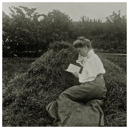 Der læses. Det er lidt svært at tidsbestemme fotografiet. Måske omkr. 1905. Det er nok igen farmand Johan som har været iscenesætteren af dette motiv. Dorthea er her iført i en nederdel, som hun benyttede i flere år, så vi må antage at hun har været glad for den. Den er jo også ret smart med lommer nede på siden.