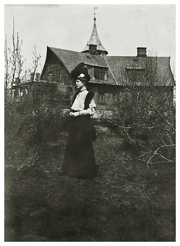 Dorthea står blandt træerne, der endnu er så lave, at det er muligt at få et godt indtryk af husets arkitektur og størrelse. Det har passet faderen, for han har højst sandsynligvis stillet datterren strategisk netop der, hvor han samtidig kunne få hele huset med på billedet. Pudsigt nok virker det som om der et par år efter, at huset blev bygget, endnu ikke er monteret gardiner oppe på 1. salen, hvor markiserne ved havestuens vinduer er på plads. Det må være forår, hvilket også understreges af at Dorthea er iført ulden nederdel og en lille vest.