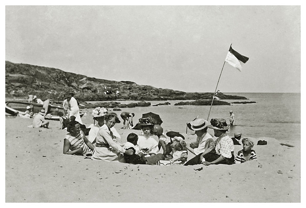 Badeliv bliver mere hverdag, når man bor på Bornholm i stedet for at være der på ferie. Her er vi på stranden i Sandvig, umiddelbart nord for Allinge. Drengen, der sidder på hug ved den flettede badestol yderst til venstre, er Dortheas lillebror Sigfred. I stolen sidder Dorthea og fra venstre er det derefter en ukendt dame, i midten sidder Dortheas mor, Thora med en lille lys sommerhat på, derefter en siddende ukendt dame og en stående ukendt dame. Damen yderst til højre er Bodil. Dorthea og en af de ukendte damer broderer og der mangler ikke små tasker, parasoller eller stænger med vimpler. Vi har undret os over den skik med flag og vimpler. Var det for at markere territoriet på stranden lidt på samme måde som tyskerne er berygtede for at bygge sandborge på stranden og dermed sige “Besetzt!”?