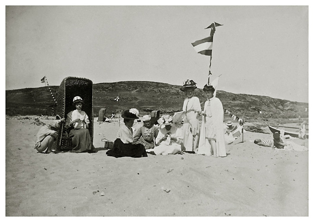 En anden dag på stranden. I gryden sidder et større selskab af damer, piger og drenge – bemærkelsesværdigt nok ingen herrer. Den 3. person fra venstre i gruppen er Dorthea’s søster, Bodil. Hun holder om en lille drengs skuldre og til højre for ham sidder Dorthea med rigt dekoreret sommerhat. Drengen yderste til højre i gruppen er Dortheas lillebror, Sigfred.