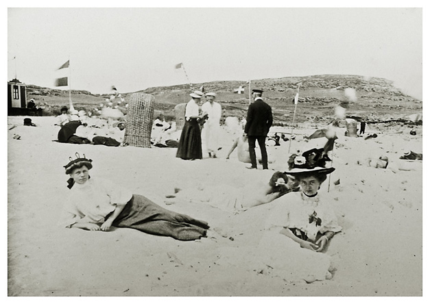 Dorthea ligger her i forgrunden til venstre og til højre har vi Karen Schrøder. Flag og vimpler har travlt i vinden, alt for travlt for kameraet så de er alle udviskede på fotografiet. Sommerhattene er fantasifulde og Dorthea’s udskiller sig ved sin relative beskedne udsmykning. Jvf. datidens anstændighedsbegreb var alle damerne fuldt påklædte efter årstiden, hvorimod mænd kunne tillade sig at ligge halvnøgne som hvalrosser i sandet.